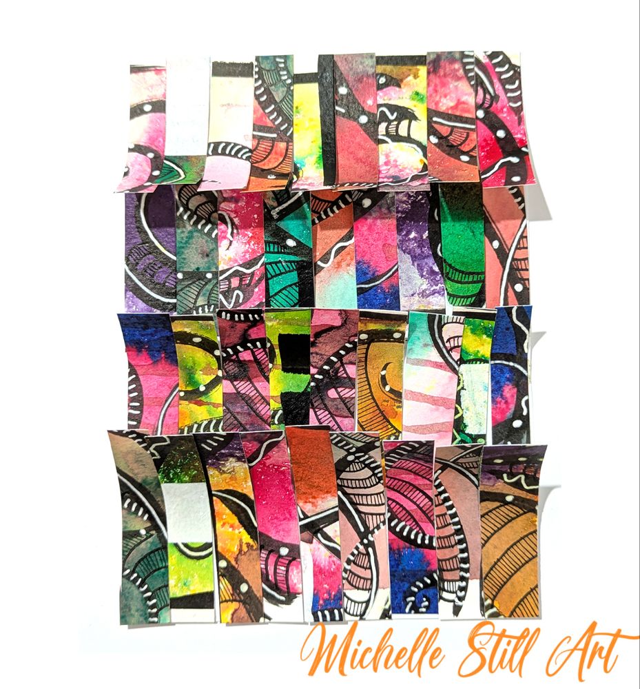 I had two pictures in a row that didn’t quite work, so the best thing for it was to chop them up and see what happened. They got chopped into teenier pieces after the video. And as soon as I took a photo it fell apart. Maybe next time I use hot glue, not double sided tape! Keep experimenting!
